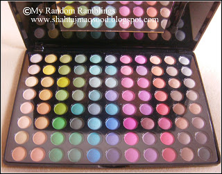 When it comes to eye shades,my philosophy is simple.”Quality over quantity”. I find that buying high end/good quality single shadows which you can than depot and put in a bigger palette is a good investment in the long run.But a lot of times i am reluctant to pay a large sum for a single eye shade in a color that i may not necessarily use on a regular basis(like reds or greens or yellows).For that , a bulk buy like this palette comes in totally handy.
